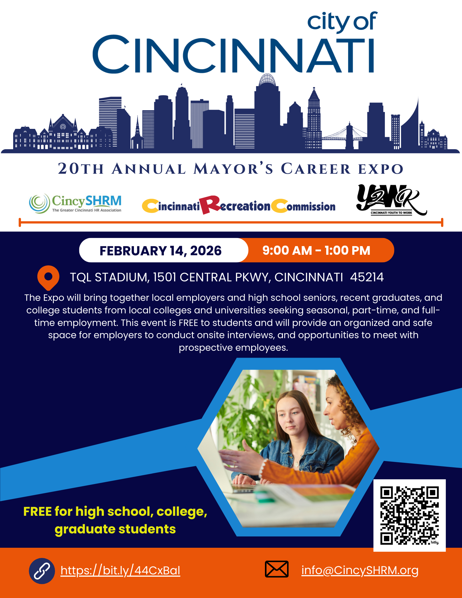 December 2, 2025 - - (Cincinnati) – Cincinnati Recreation Commission presents the 20th Annual Cincinnati Mayor’s Career Expo powered by CincySHRM. Candidates and employers are invited to meet at TQL Stadium, 1501 Central Parkway, Cincinnati on February 14 from9:00am-1:00pm. The Mayor's Annual Expo and Cincinnati Recreation Commission Y2WK (Youth 2 Work) program puts approximately 1200+ high school seniors, graduates, and local college and university students in front of local employers. Seasonal, short-term, and long-term employment opportunities are available to qualified individuals. The event is FREE to attend and provides a professional, organized, and safe location for prospective employees and employers to conduct on-site interviews. Employers can register and purchase table/booth to meet their needs at: https://cincyshrm.glueup.com/event/cincinnati-mayors-career-expo-2026-163372/ces-people-love-156367/